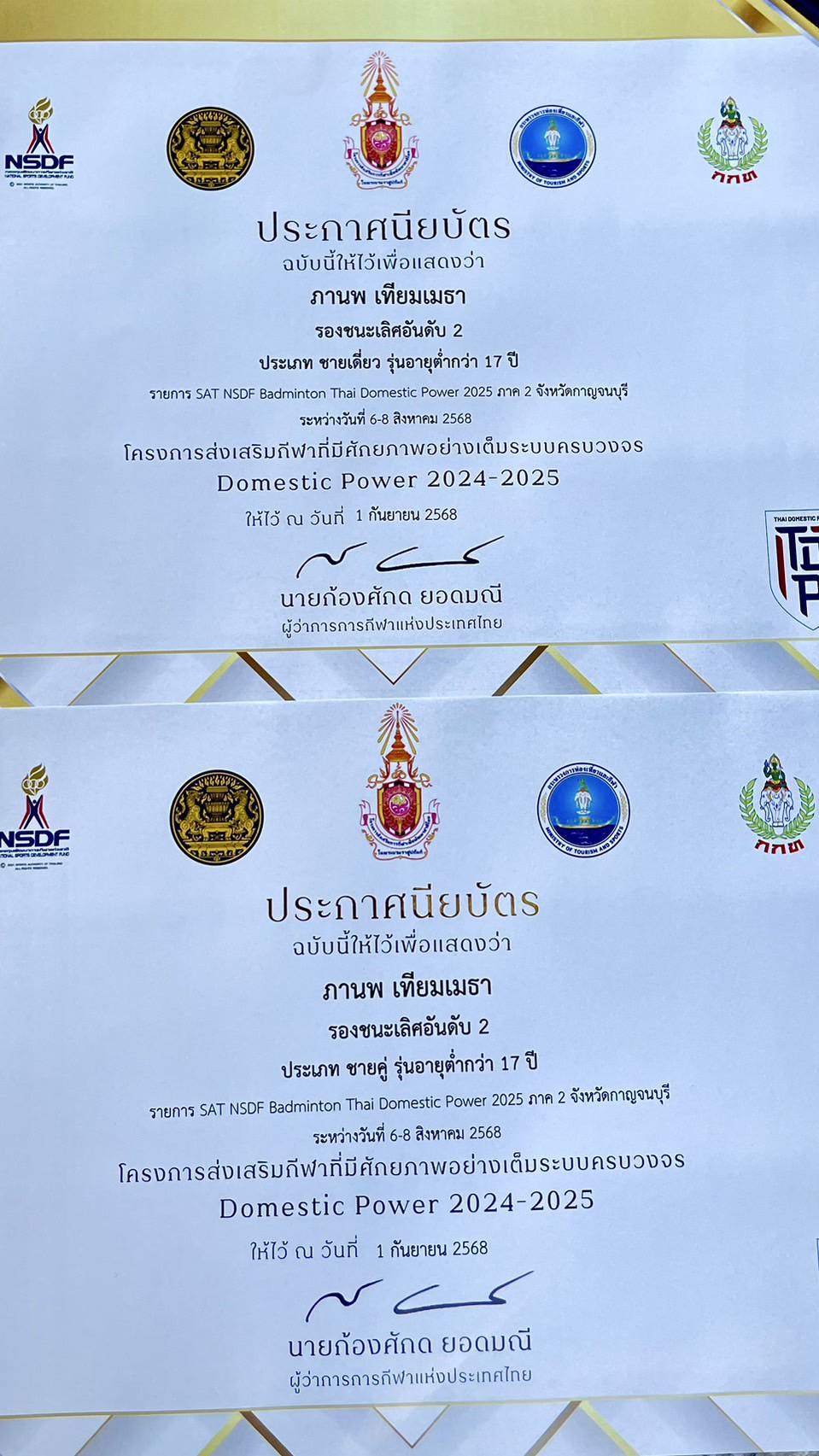 ขอแสดงความยินดีกับ นายภานพ เทียมเมธา นักเรียนชั้นมัธยมศึกษาปีที่ 4 โรงเรียนสาธิตแห่งมหาวิทยาลัยราชภัฏหมู่บ้านจอมบึง ที่ได้รับรางวัลรายการ SAT NSDF Badminton Thai Domestic Power 2025 ภาค2 จังหวัดกาญจนบุรี โครงการส่งเสริมกีฬาที่มีศักยภาพอย่างเต็มระบบครบวงจร Domestic Power 2024 - 2025 ในระหว่างวันที่ 6 - 8 สิงหาคม 2568 ที่ผ่านมา ณ สนามแบดมินตันเทศบาลกาญจนบุรีจ.กาญจนบุรี (ภาค 2) สถานที่รับรางวัล เซนทรัลแจ้งวัฒนะ มอบรางวัลโดยท่าน ดร.ก้องศักด ยอดมณี ผู้ว่าการกีฬาแห่งประเทศไทย โรงเรียนสาธิตฯ ขอแสดงความยินดีเป็นอย่างยิ่ง