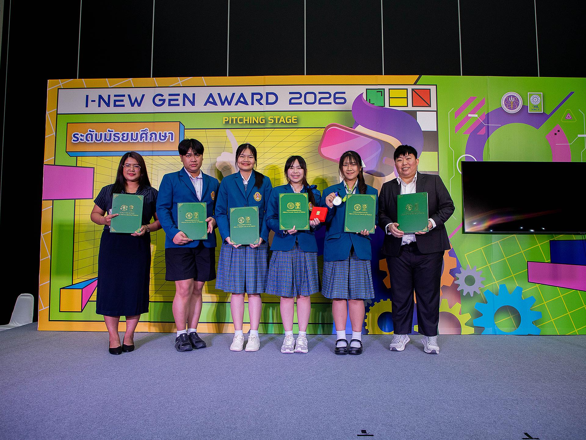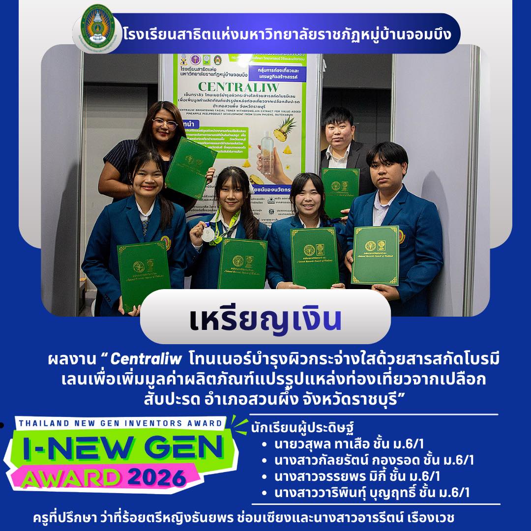 ขอแสดงความยินดีกับนักเรียนที่ได้รางวัลการประกวดโครงการสิ่งประดิษฐ์และนวัตกรรมระดับเยาวชน Thailand New Gen Inventors Award 2026 (I – New Gen Award 2026) (รอบตัดสิน) ระดับมัธยมศึกษา ระหว่างวันที่ 5 – 9 มกราคม 2569 ณ Event Hall 100 – 101 ศูนย์นิทรรศการและการประชุมไบเทค บางนา กรุงเทพฯ
