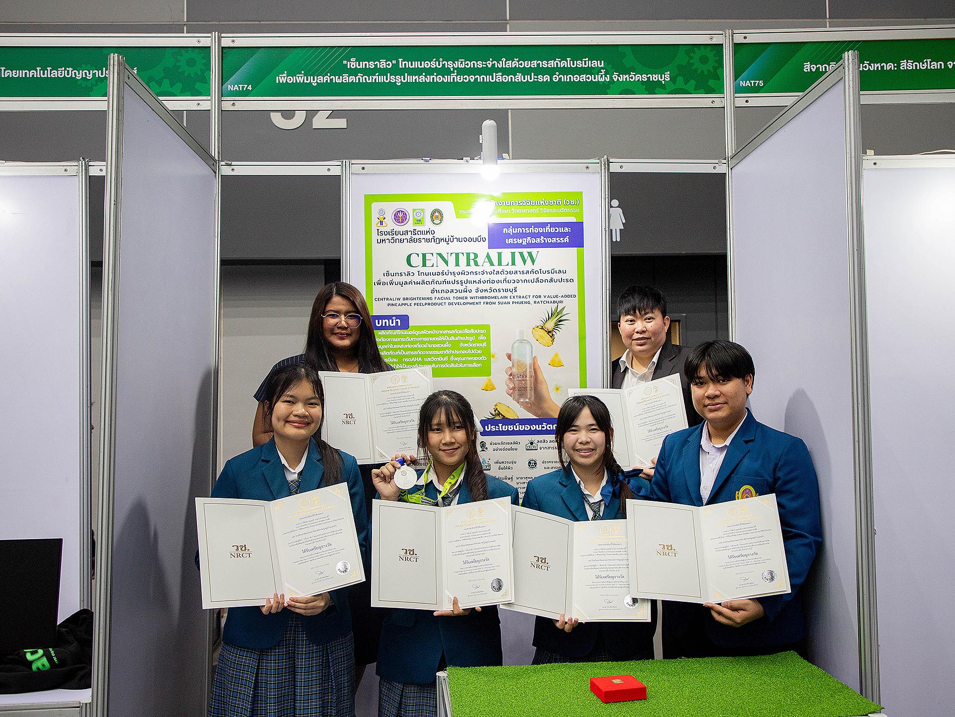 รางวัลเหรียญเงิน ผลงานกลุ่มการท่องเที่ยวและเศรษฐกิจสร้างสรรค์ "เซ็นทราลิว โทนเนอร์บำรุงผิวกระจ่างใสด้วยสารสกัดโบรมีเลน เพื่อเพิ่มมูลค่าผลิตภัณฑ์แปรรูปแหล่งท่องเที่ยวจากเปลือกสับปะรด อำเภอสวนผึ้ง จังหวัดราชบุรี" (Centraliw Brightening Facial Toner withBromelain Extract for Value-Added Pineapple PeelProduct Development from Suan Phueng, Ratchaburi)