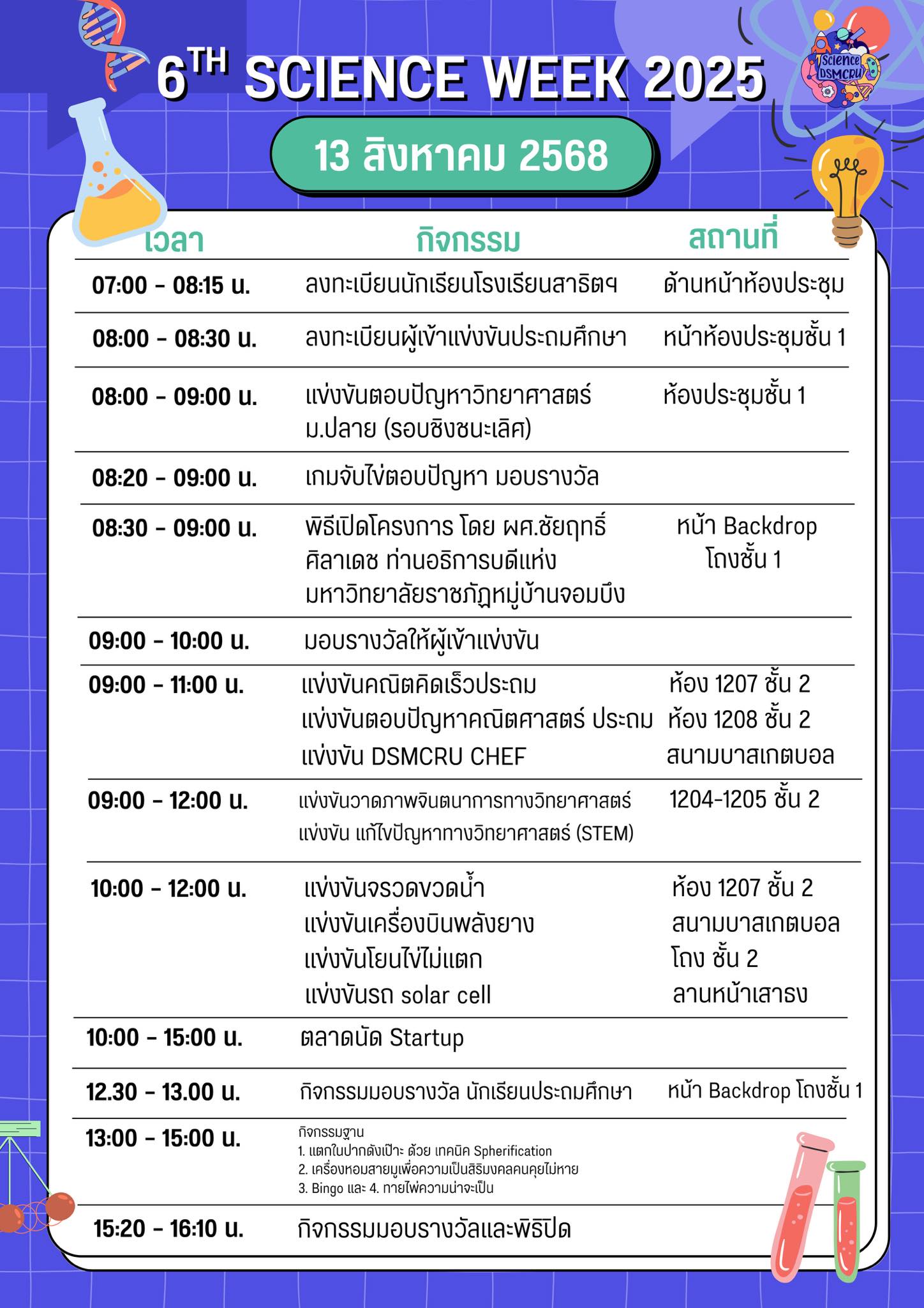 ตารางกิจกรรมสัปดาห์วิทยาศาสตร์ ปีการศึกษา 2568 วันที่ 13 สิงหาคม 2568