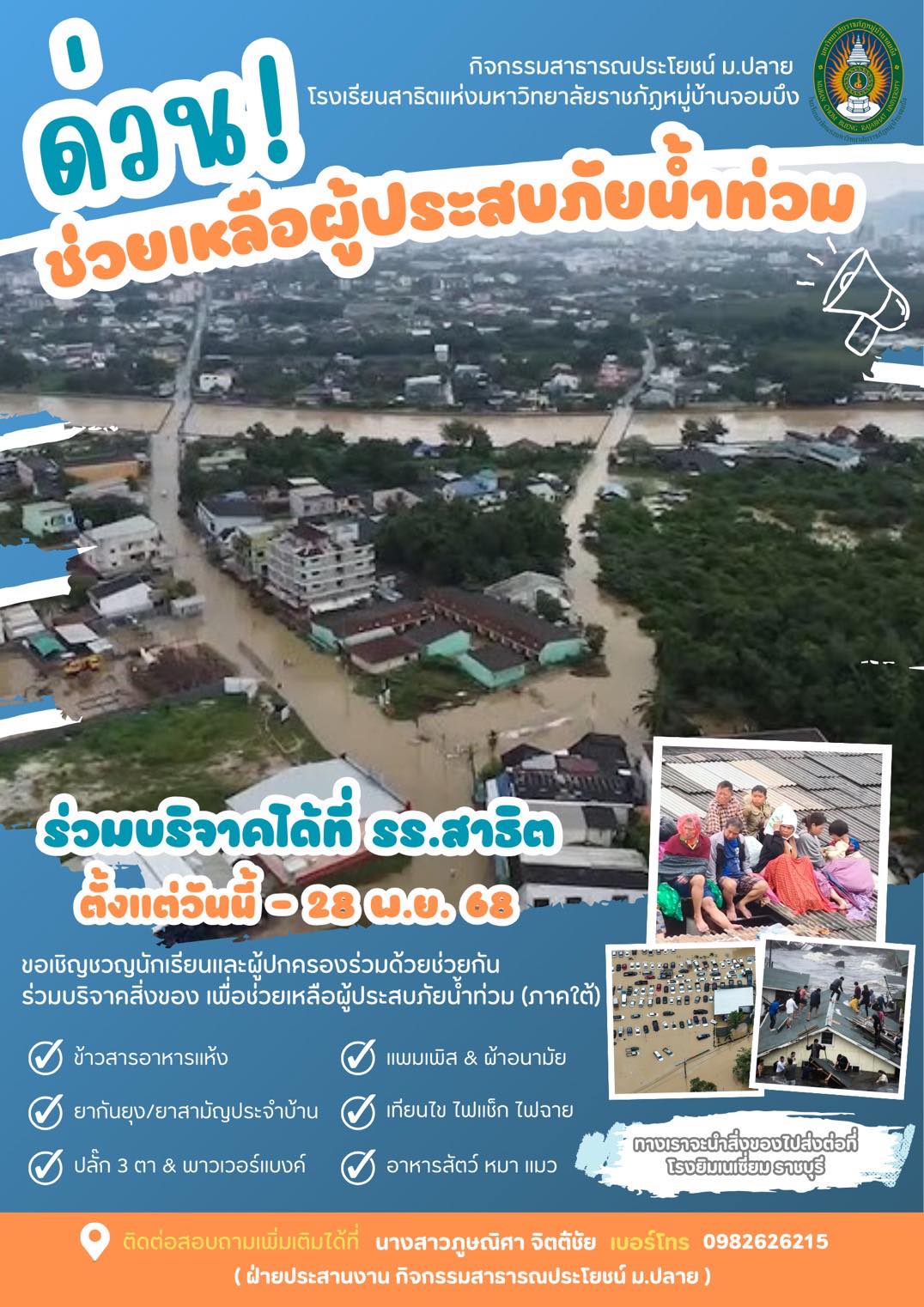 ประชาสัมพันธ์ ขอเชิญชวนผู้ปกครองและนักเรียนร่วมบริจาคสิ่งของช่วยผู้ประสบภัยน้ำท่วม นักเรียนกิจกรรมสาธารณะประโยชน์ ระดับชั้นมัธยมตอนปลาย ขอเชิญชวนผู้ปกครองและนักเรียนร่วมบริจาคสิ่งของช่วยเหลือผู้ประสบภัยน้ำท่วม เพื่อส่งต่อให้ศูนย์รวบรวมที่โรงยิมเนเซียม จ.ราชบุรี เพื่อช่วยเหลือประชาชนที่ประสบภัยน้ำท่วม อ.หาดใหญ่ จ.สงขลา