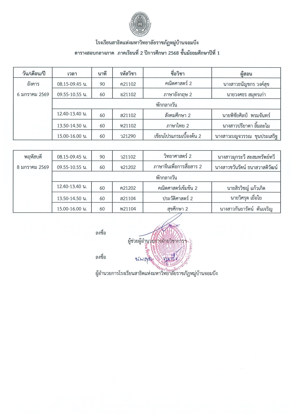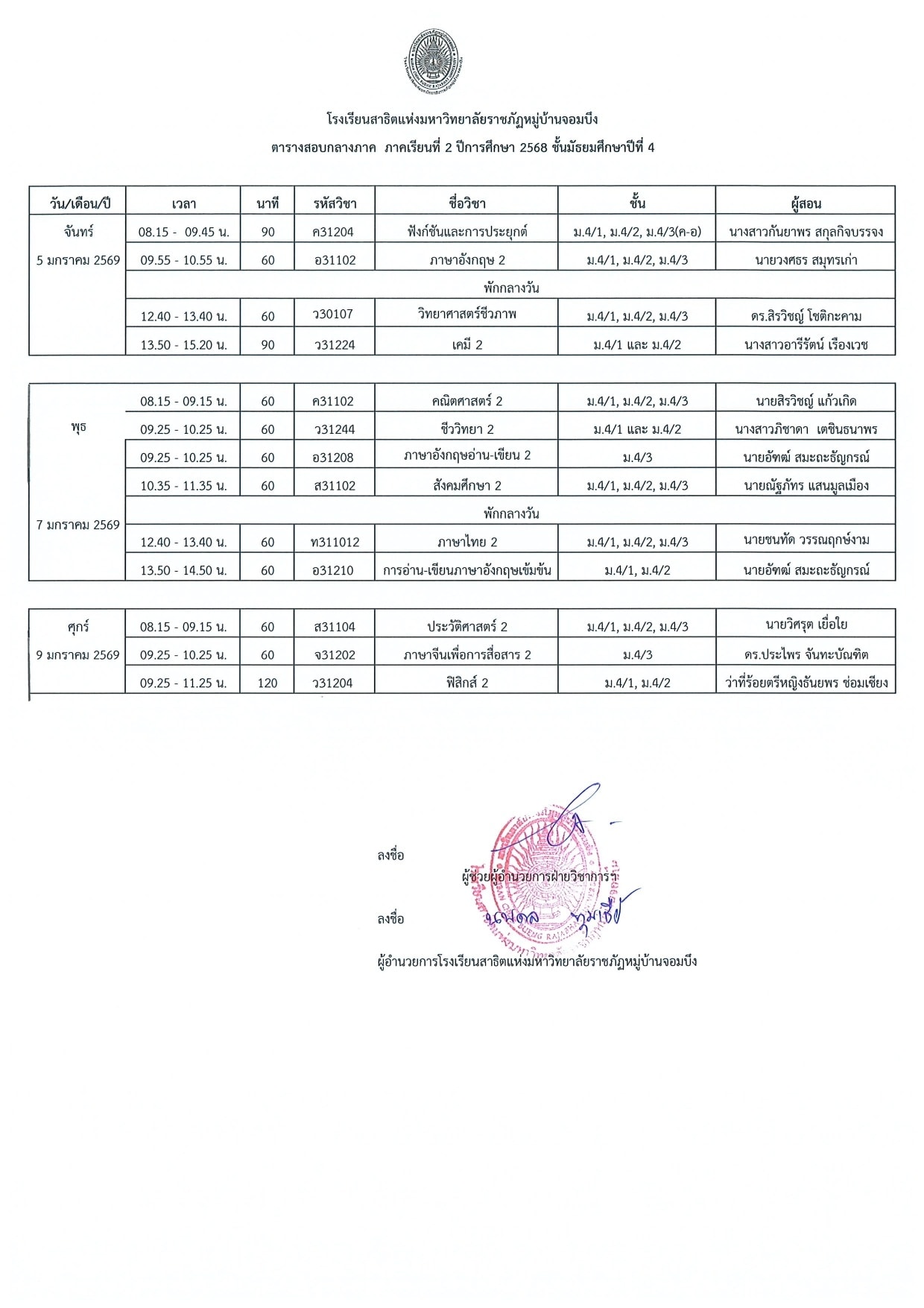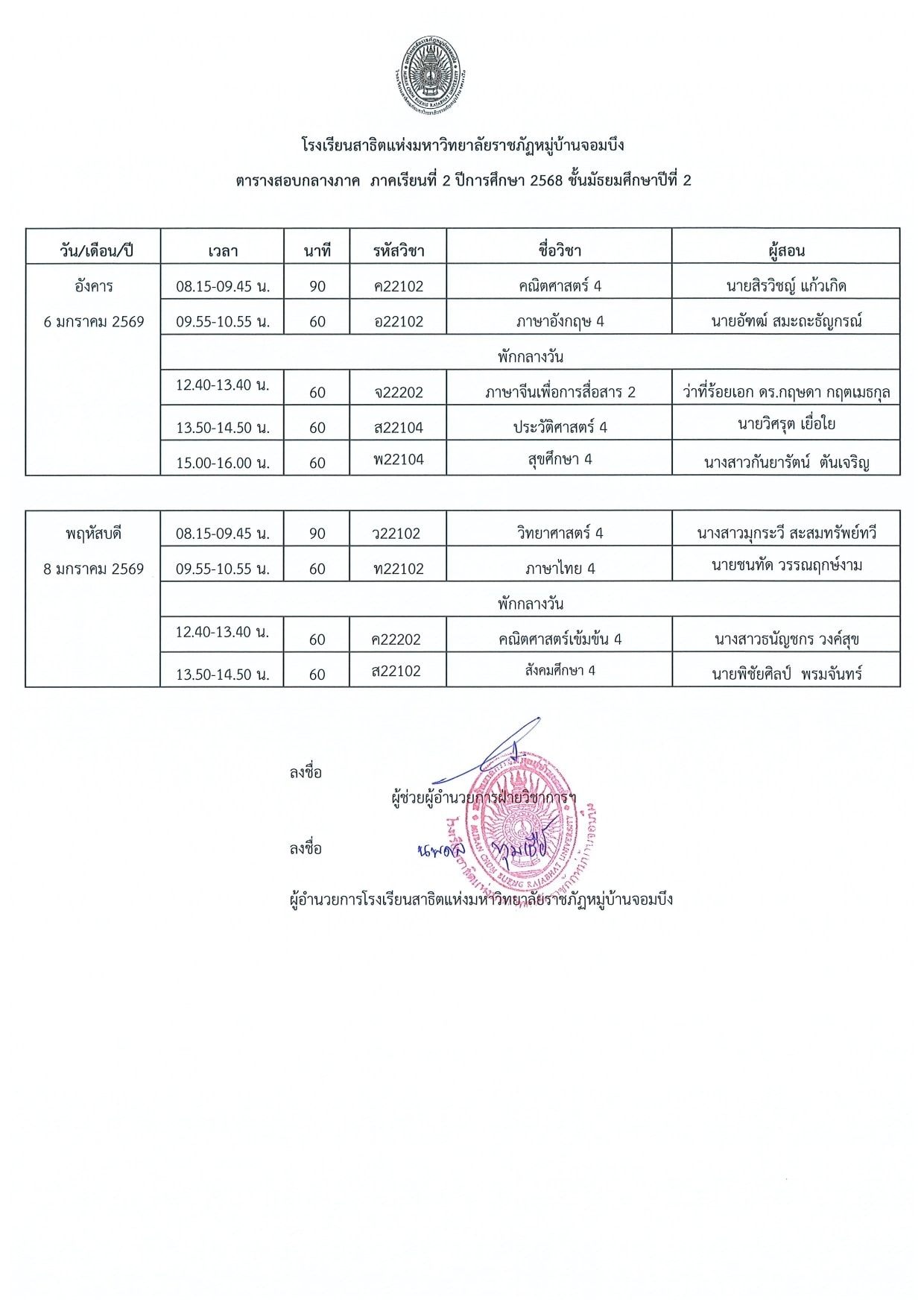 ตารางสอบกลางภาค ภาคเรียนที่ 2 ประจำปีการศึกษา 2568