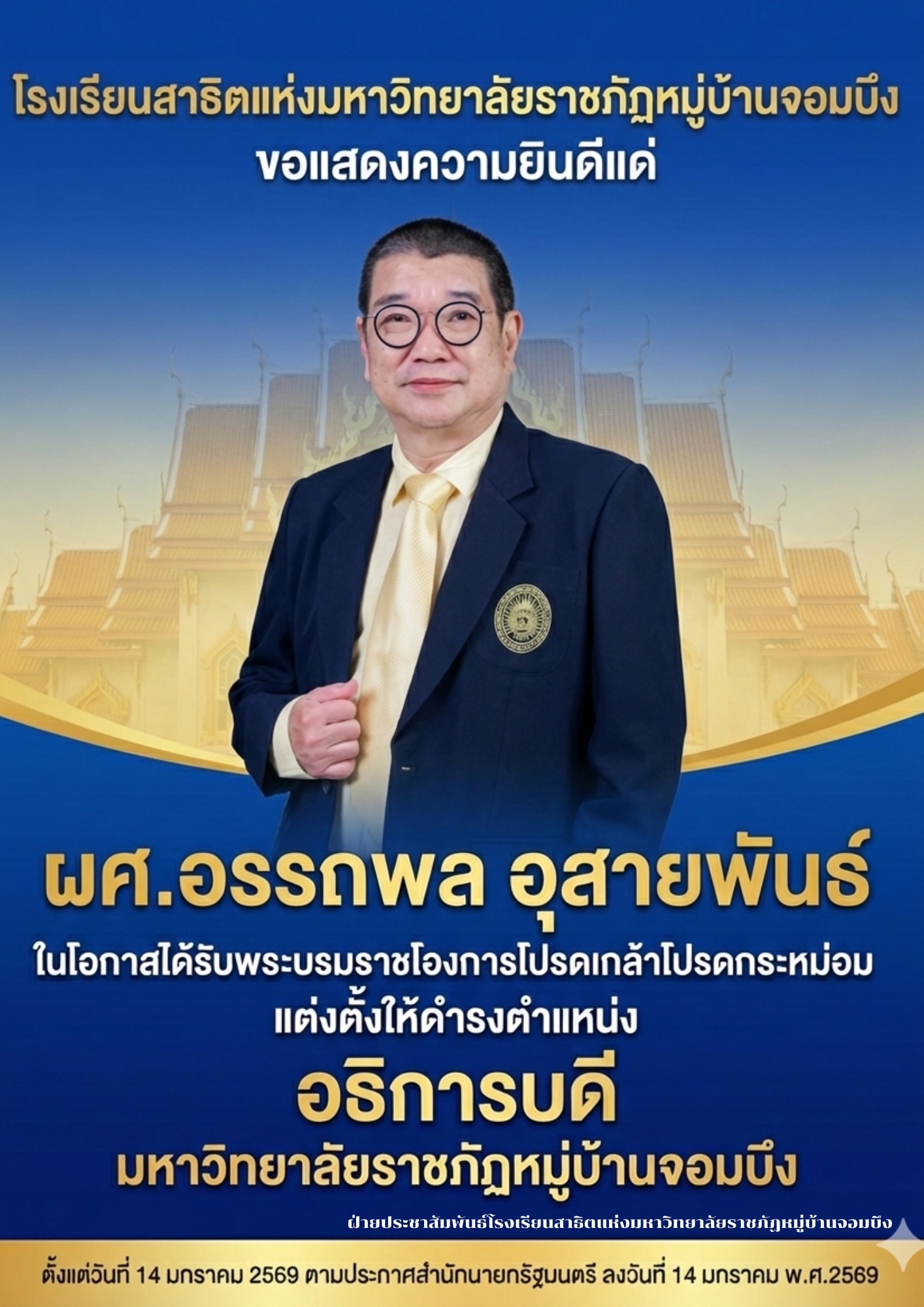 โรงเรียนสาธิตแห่งมหาวิทยาลัยราชภัฏหมู่บ้านจอมบึง ขอแสดงความยินดีอย่างยิ่ง แด่ ผู้ช่วยศาสตราจารย์อรรถพล อุสายพันธ์ ในโอกาสได้รับพระบรมราชโองการโปรดเกล้าโปรดกระหม่อมแต่งตั้งให้ดำรงตำแหน่ง อธิการบดีมหาวิทยาลัยราชภัฏหมู่บ้านจอมบึง ตั้งแต่วันที่ 14 มกราคม 2569 ตามประกาศสำนักนายกรัฐมนตรี ลงวันที่ 14 มกราคม พ.ศ. 2569 .