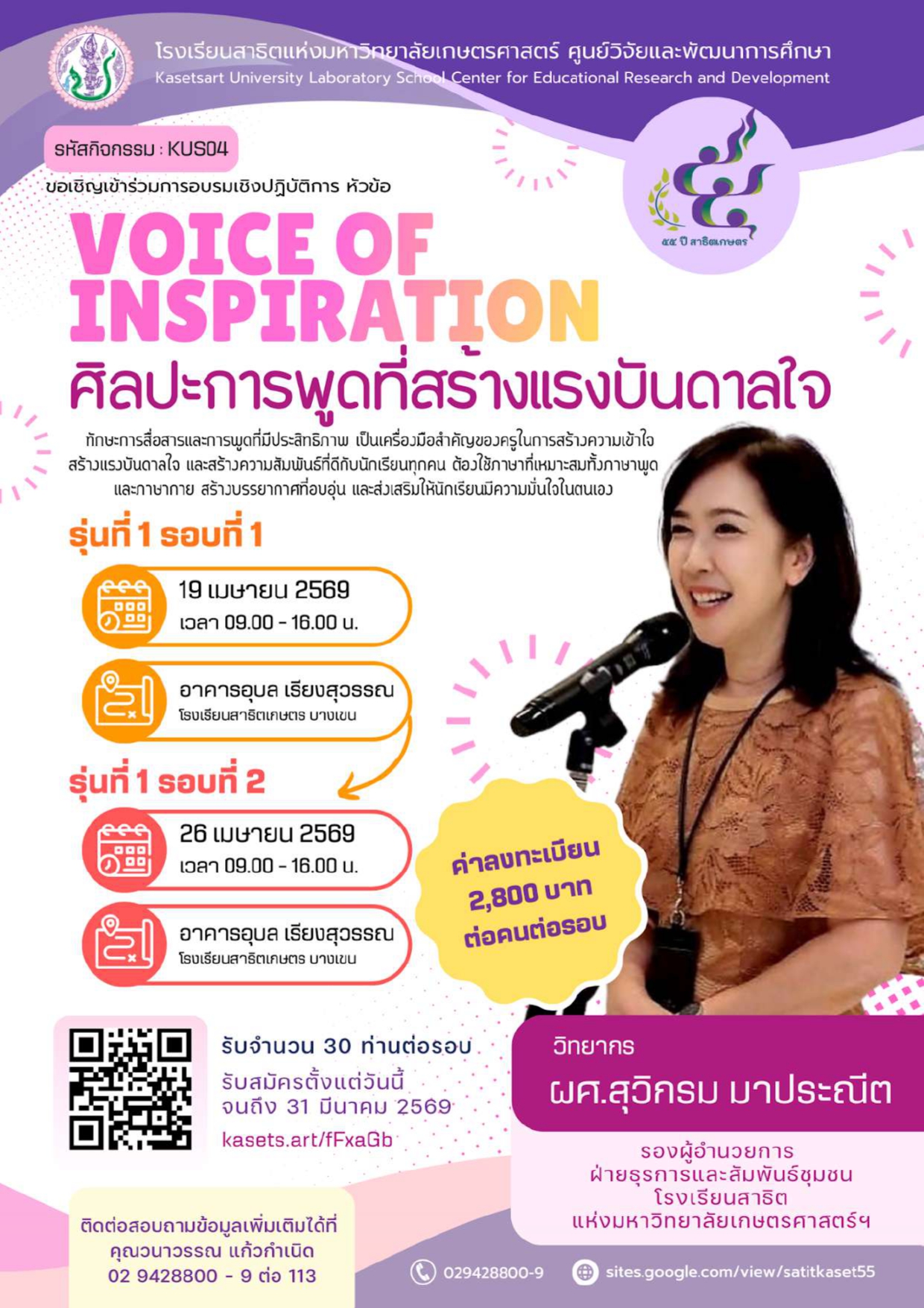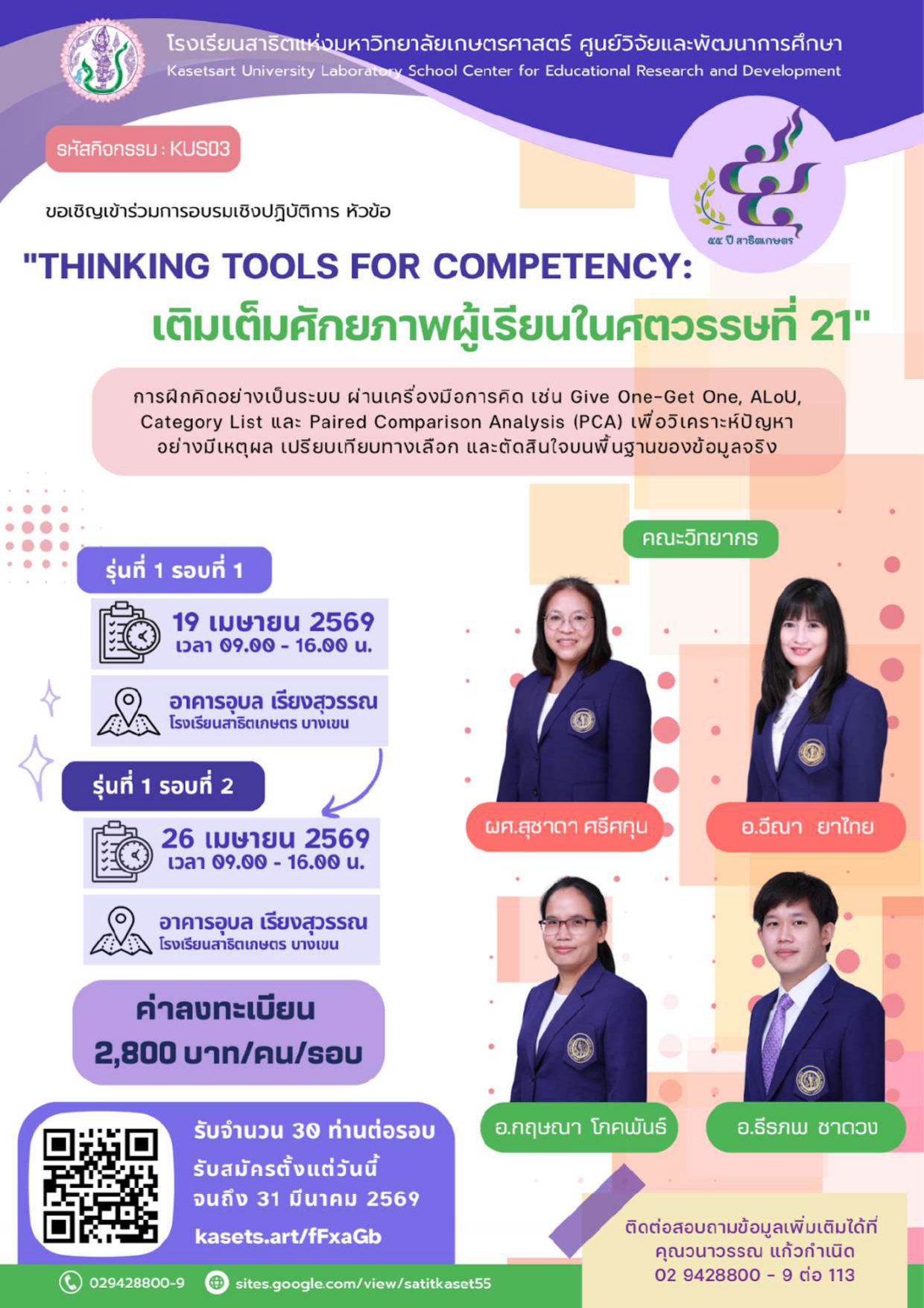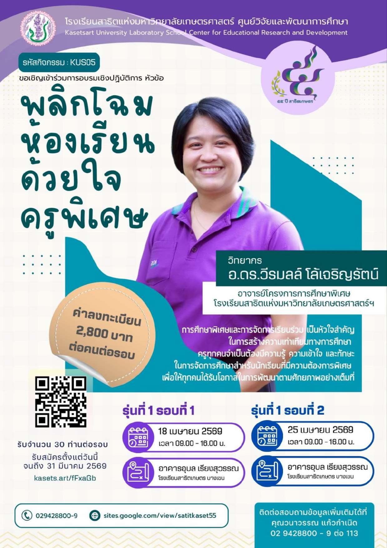 เนื่องในโอกาสครบรอบ 55 ปี โรงเรียนสาธิตแห่งมหาวิทยาลัยเกษตรศาสตร์ ศูนย์วิจัย และพัฒนาการศึกษา โรงเรียนได้จัดกิจกรรมอบรมเชิงปฏิบัติการ เพื่อให้ความรู้ความเข้าใจในยุคที่การศึกษาเปลี่ยนแปลงอย่างรวดเร็ว ครูผู้สอนจำเป็นต้องพัฒนาตนเองให้ทันต่อการเปลี่ยนแปลงของสังคมและเทคโนโลยีการจัดการเรียนการสอนในศตวรรษที่ 21 เพื่อตอบสนองความต้องการความต้องการของนักเรียนที่หลากหลาย รวมถึงผู้เรียนที่มีความต้องการพิเศษ จึงขอเชิญผู้สนใจเข้าร่วมอบรมเชิงปฏิบัติการ โดยรับจำนวนจำกัด รอบละ 30 คน ค่าลงทะเบียน 2,800 บาท