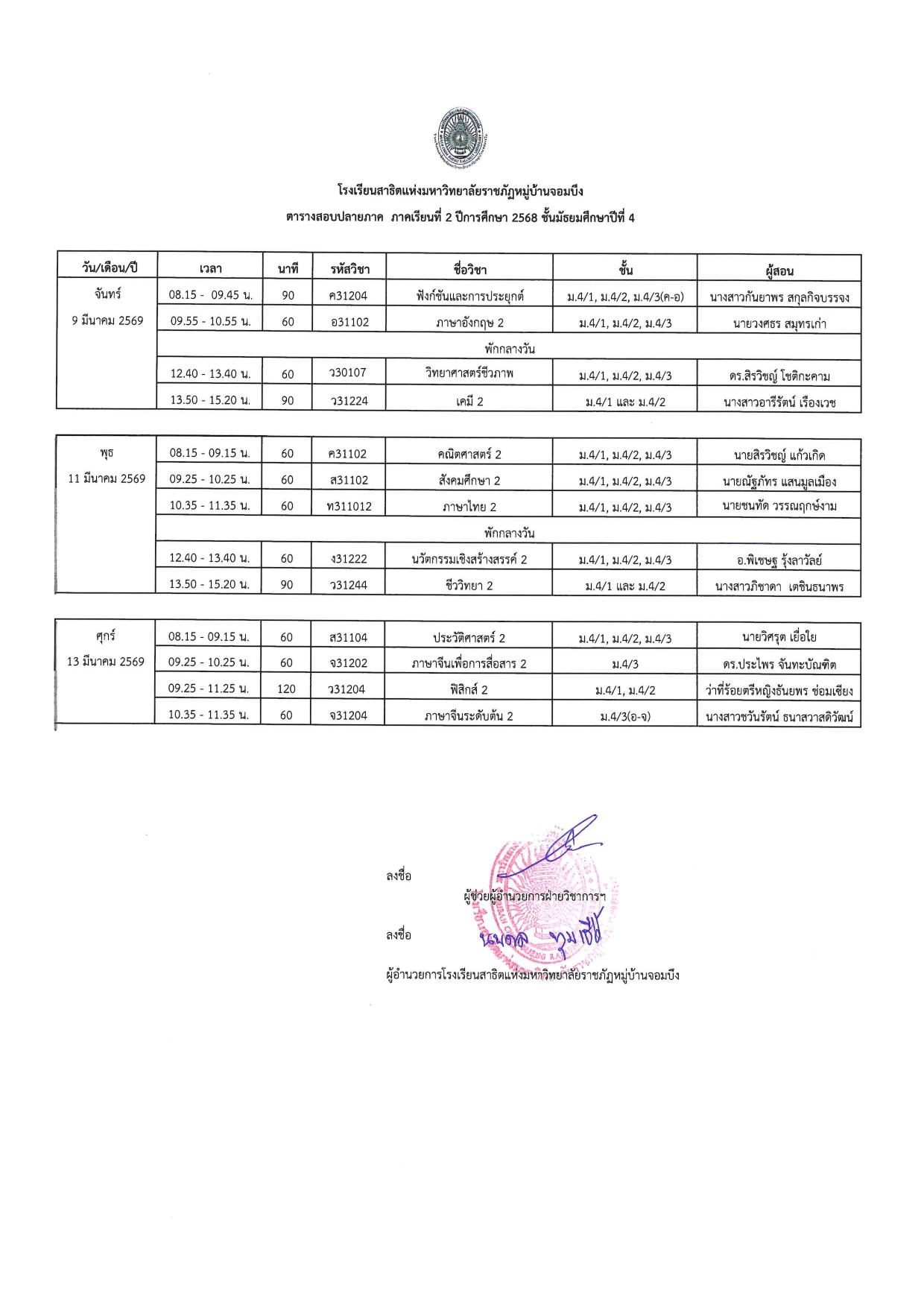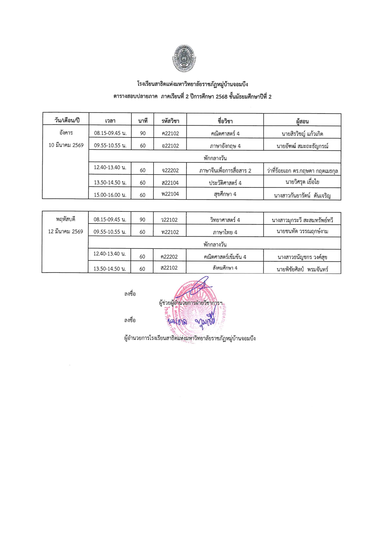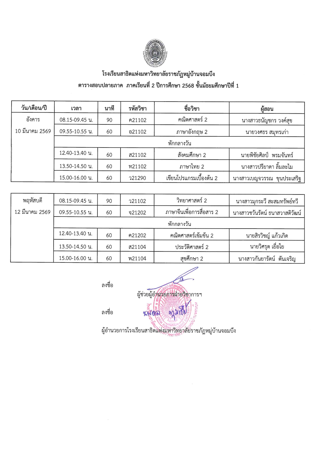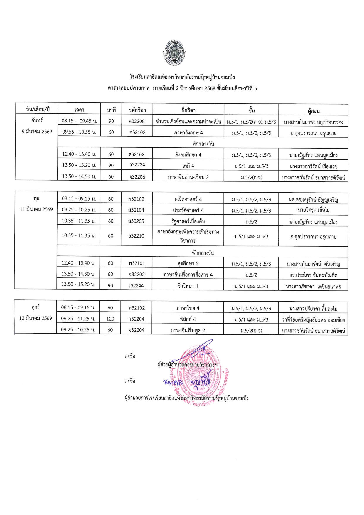 ตารางสอบปลายภาค 2/2568 ชั้น ม.1 ชั้น ม.2 ชั้น ม.4 และชั้น ม.5