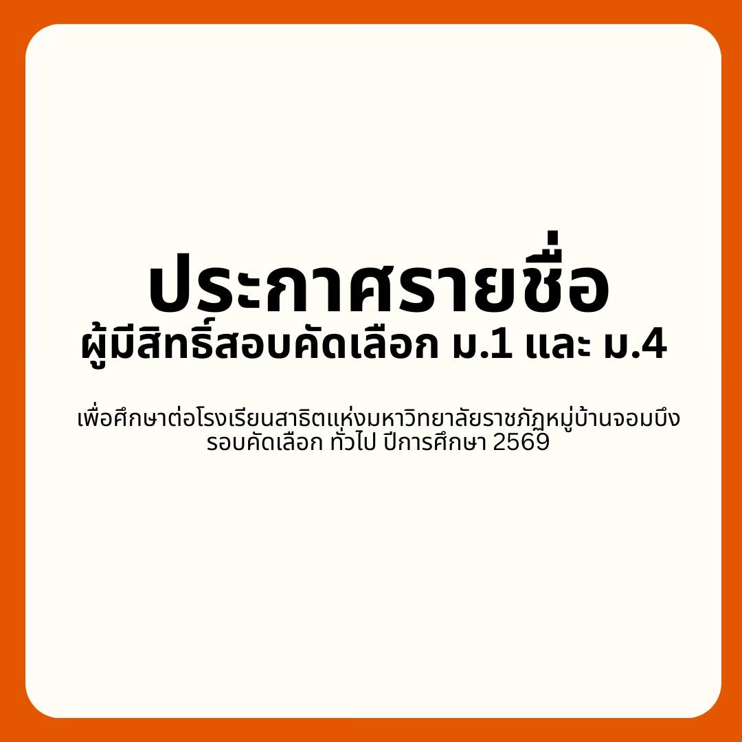 ในการนี้ มหาวิทยาลัยราชภัฏหมู่บ้านจอมบึง จึงขอประกาศรายชื่อผู้ที่มีรายชื่อเข้ารับการทดสอบคัดเลือกเพื่อเป็นนักเรียนระดับชั้นมัธยมศึกษาปีที่ ๑ และชั้นมัธยมศึกษาปีที่ ๔ ปีการศึกษา ๒๕๖๙ รอบคัดเลือกทั่วไป โดยกำหนดวันเวลาและสถานที่ในการทดสอบคัดเลือกดังต่อไปนี้