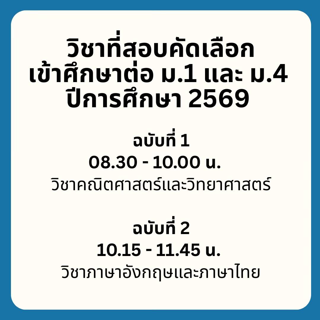 ประกาศรายชื่อผู้มีสิทธิ์เข้ารับการทดสอบคัดเลือกนักเรียนระดับชั้น ม.1 และ ม.4 ประจำปีการศึกษา 2569 รอบคัดเลือกทั่วไป