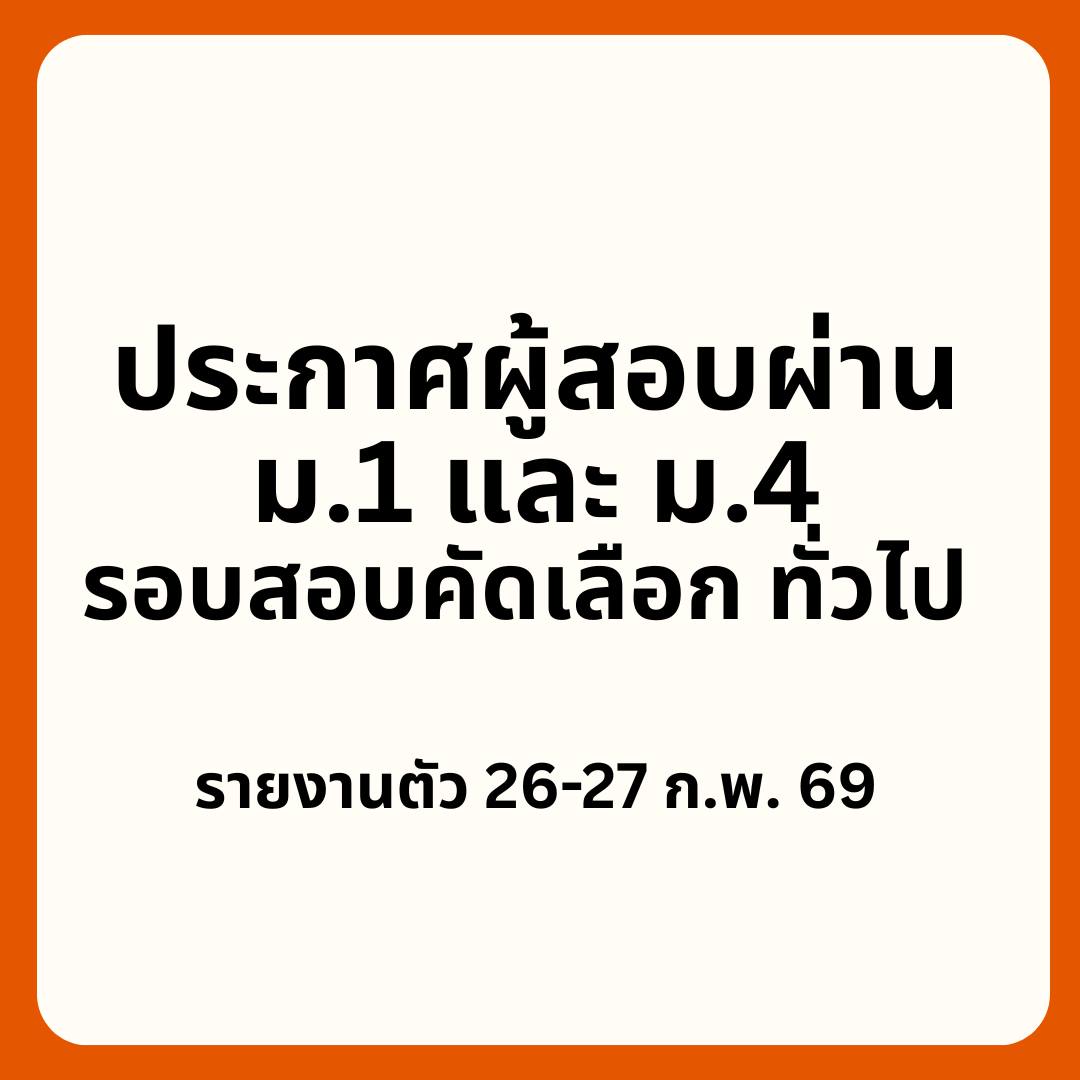 ประกาศผู้สอบผ่านการคัดเลือกเข้าศึกษาต่อ ระดับชั้น ม.1 และ ม.4 ปีการศึกษา 2569 รอบสอบคัดเลือก ทั่วไป โรงเรียนสาธิตแห่งมหาวิทยาลัยราชภัฏหมู่บ้านจอมบึงให้ผู้สอบผ่านตัวจริง มารายงานตัวพร้อมชำระเงินค่าบำรุงการศึกษาและค่าธรรมเนียมการศึกษาเฉพาะกรณี ในวันที่ 26-27 กุมภาพันธ์ 2569 เวลา 9.00 - 15.00 น. ณ โรงเรียนสาธิตแห่งมหาวิทยาลัยราชภัฏหมู่บ้านจอมบึง
